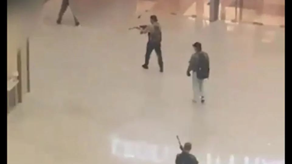 Na imagem, 3 homens atiram contra pessoas do lado de fora da sala de concerto da casa de shows Crocus City Hall, na Rússia.