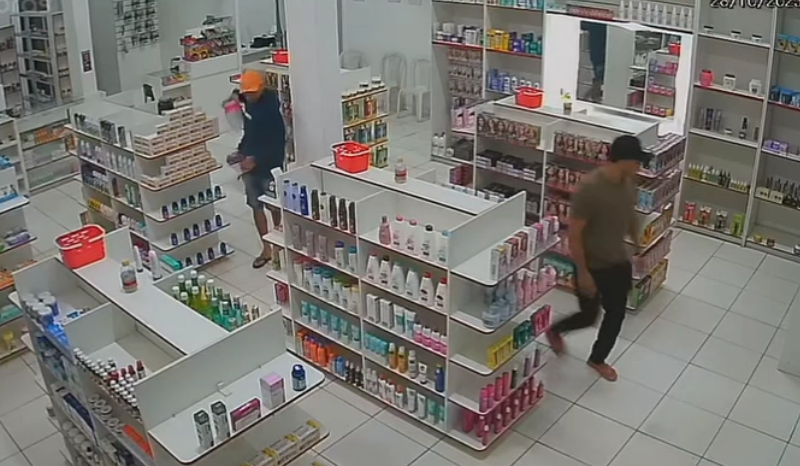 Em outro ângulo de uma das câmeras de segurança, ainda é possível notar que os suspeitos levaram as mulheres para uma espécie de galpão que fica nos fundos da drogaria.
