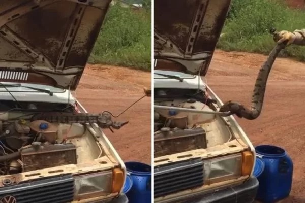 Para retirar o animal, a equipe contou com a ajuda de um “pinção”. Em seguida, o animal silvestre foi devolvido ao habitat natural. O réptil encontrado no carro é uma jiboia.