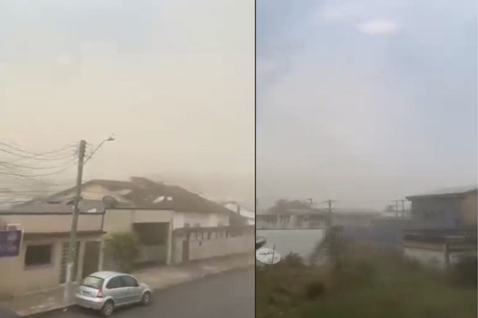 No vídeo, a cidade aparece tomada pela ventania misturada à fumaça. Nos aplicativos de mensagens, vários moradores relataram dificuldades para respirar e enxergar.