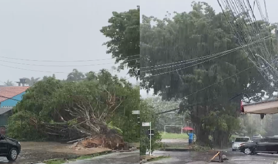 Além da chuva, fortes ventos foram registrados o que ajudou a arrancar a árvore do chão. Moradores da área gravaram vídeos e informaram que fios da rede elétrica estão no chão.
