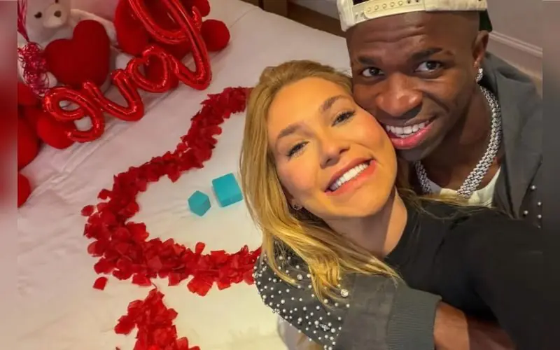 O jogador do Real Madrid publicou nesta terça-feira (28) o primeiro post oficial ao lado da influenciadora. Nas fotos, os dois aparecem abraçados em um quarto decorado com pétalas de rosas vermelhas, balões prateados e joias sobre a cama. Na legenda, o atacante escreveu apenas um coração e a palavra “Love”, simbolizando o momento.